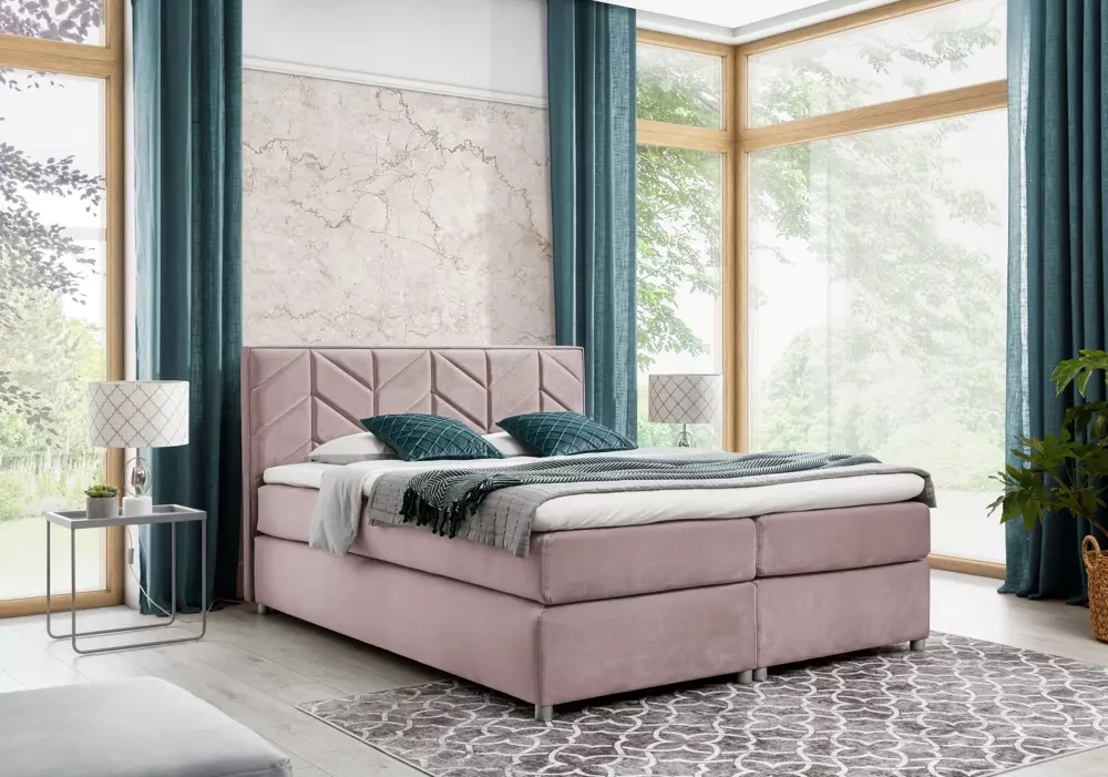 SERINA är en säng i modern form som fungerar i alla moderna interiörer. Den vadderade kroppen täckt med ett mjukt velourtyg ser vackert ut och kommer att skapa en varm och mysig atmosfär i ditt sovrum. Den höga sänggaveln är dekorerad med geometriska sömmar som effektivt kommer att fånga ögat och glädja alla hushållsmedlemmar och gäster. SERINA sovrumssäng har en skiktad struktur som är karakteristisk för kontinentalsängar. Möbler har en stabil lådbotten med fickmadrass. Toppmadrassen består av högelastiskt skum som reglerar temperaturen och reagerar på minsta rörelse. Den ger också extra elasticitet och mjukhet, tack vare vilken den garanterar en lugn och behaglig sömn. Sängen är idealisk för par, för tack vare denna konstruktion stör rörelsen hos en person inte den andras sömn. Det hela bygger på smala ben i silverfärg.