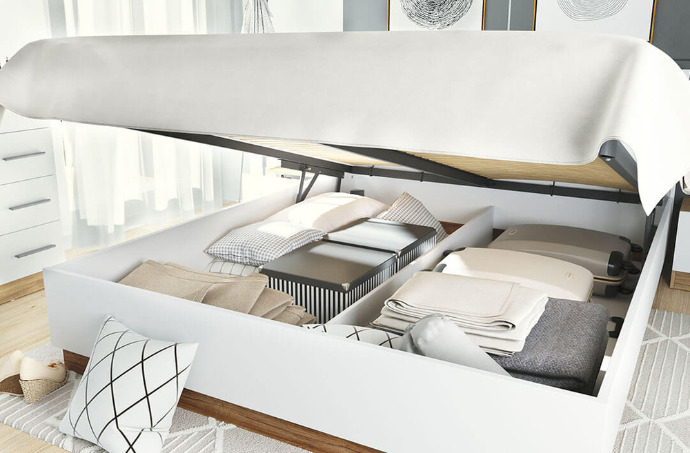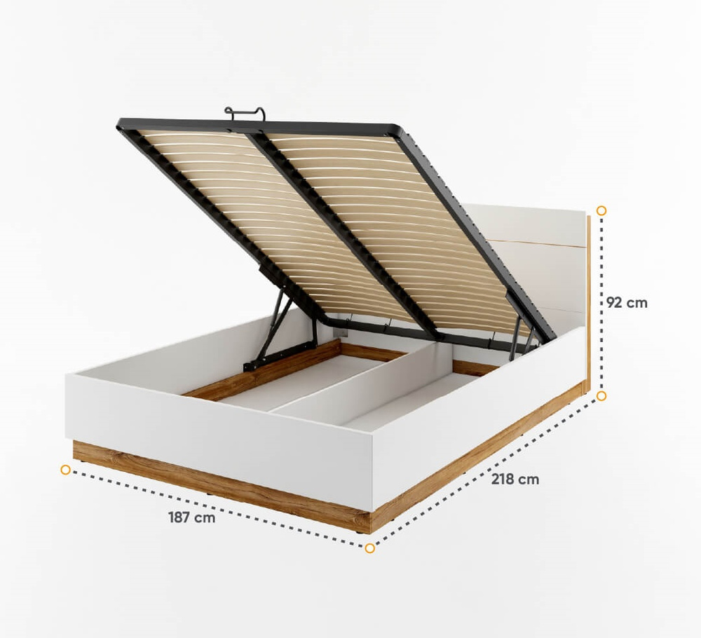 DENTRO-sängen är en stor och bekväm säng som kan användas för en person eller ett par. Dess moderna design är främst baserad på användningen av klassiska färger, som vitt och naturliga träfärger, som ger den ett tidlöst utseende. Den största fördelen med denna säng är den höga sänggaveln som har en praktisk hylla. Du kan placera böcker, glasögon och annat du vill ha inom räckhåll. Det är också ett perfekt ställe att dölja kablar till laptop eller telefon. En hylla i sänggaveln är en bra lösning, särskilt i små sovrum, eftersom den låter dig klara dig utan ett sängbord, vilket sparar utrymme. Nackstödet är utrustat med energisnål LED-belysning som sprider mjukt ljus och skapar en magisk atmosfär. Denna lösning kommer att tilltala människor som inte gillar att sova i totalt mörker. Innanför sängstommen finns ett stort förråd där du kan förvara inte bara sängkläder, utan även allt det som inte får plats i skåpet, som resväskor, kläder för olika säsonger eller sporttillbehör. Tack vare en speciell gaslyftmekanism är det enkelt och problemfritt att lyfta ramen.