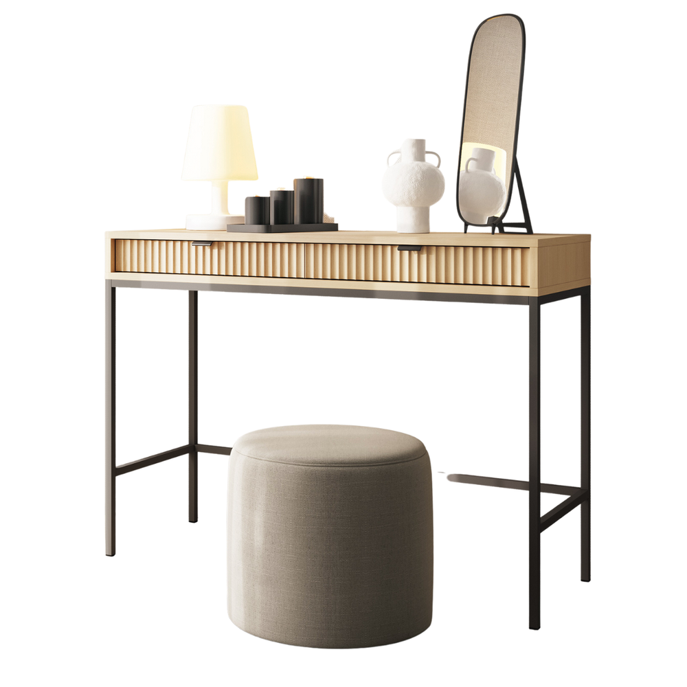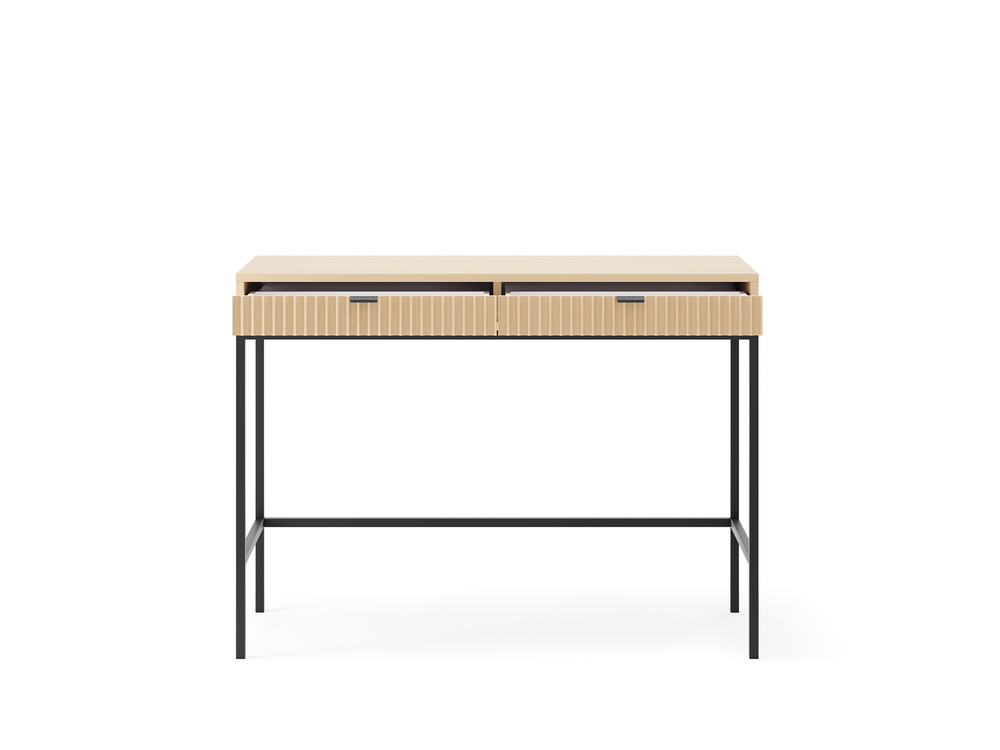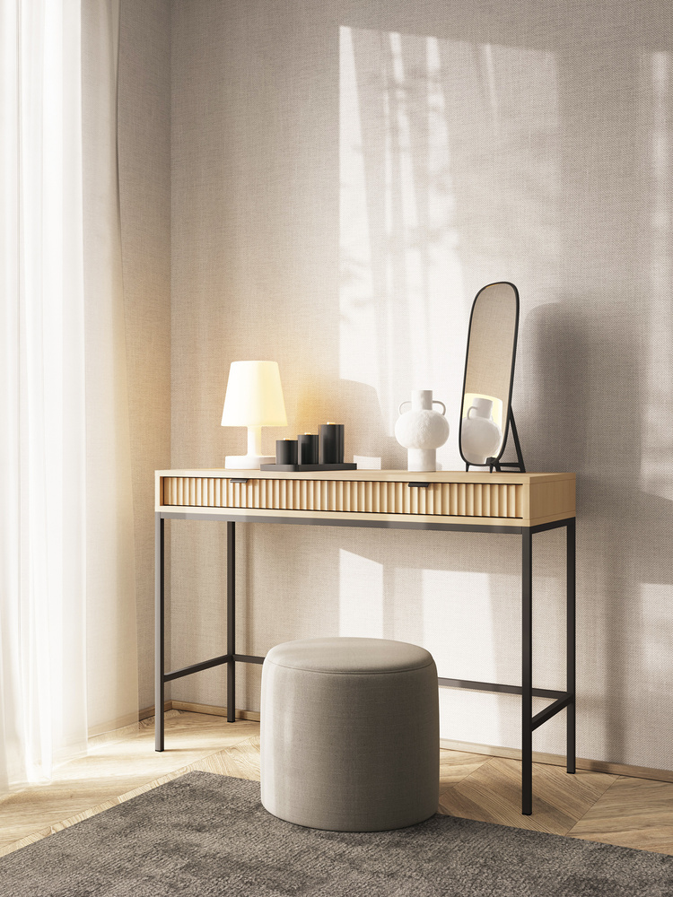 Det moderna sminkbordet Volare hjälper dig att avsätta ett dedikerat utrymme i din lägenhet för vardagliga sysslor. På den rymliga bänkskivan hittar du tillräckligt med utrymme för att fungera som sminkbord och enkelt placera din favoritkosmetik. I två praktiska lådor kan du organisera tillbehör, tack vare vilka allt kommer att vara tillgängligt och du kan enkelt skapa vacker smink. Sminkbordets intressanta utseende betonas av en metallram som är öppen på ena sidan. Denna lösning låter dig flytta möblerna och ger även bekvämt benutrymme. Detta är dock inte alla fördelarna med VOLARE-modellen! Du kan också framgångsrikt använda dem som ett skrivbord eller en konsol för hallen. Skrivbordets minimalistiska design framhävs av den dekorativa, räfflade fronten, tack vare vilken möblerna passar perfekt in i dagens trender. Sminkbordet imponerar med sin djupa, svarta färg. Den neutrala nyansen gör det mycket lättare att matcha den till inredningen, så att du enkelt kan skapa ett intressant arrangemang.