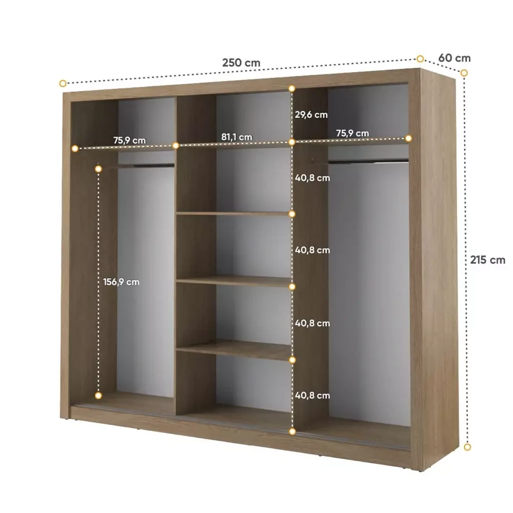 ARTI tredörrars garderob med spegel är den perfekta produkten för dig! Kompakt i dimensionerna, den kommer att vara perfekt för ett sovrum, kontor, ungdomsrum eller hall. Spegelfronter förstorar rummet optimalt, tillför mer ljus och låter dig även se dig själv i dem medan du provar kläder. Garderob i ek shetland färg är utrustad med två stavar, tack vare vilka du kan hänga kläder av olika längder. Vi har även sju rymliga hyllor i olika storlekar där du kan organisera dina kläder, förvara extra sängkläder eller gömma ditt handbagage. Garderoben är gjord av slitstark laminerad skiva och kanterna är avslutade med slitstark ABS.
