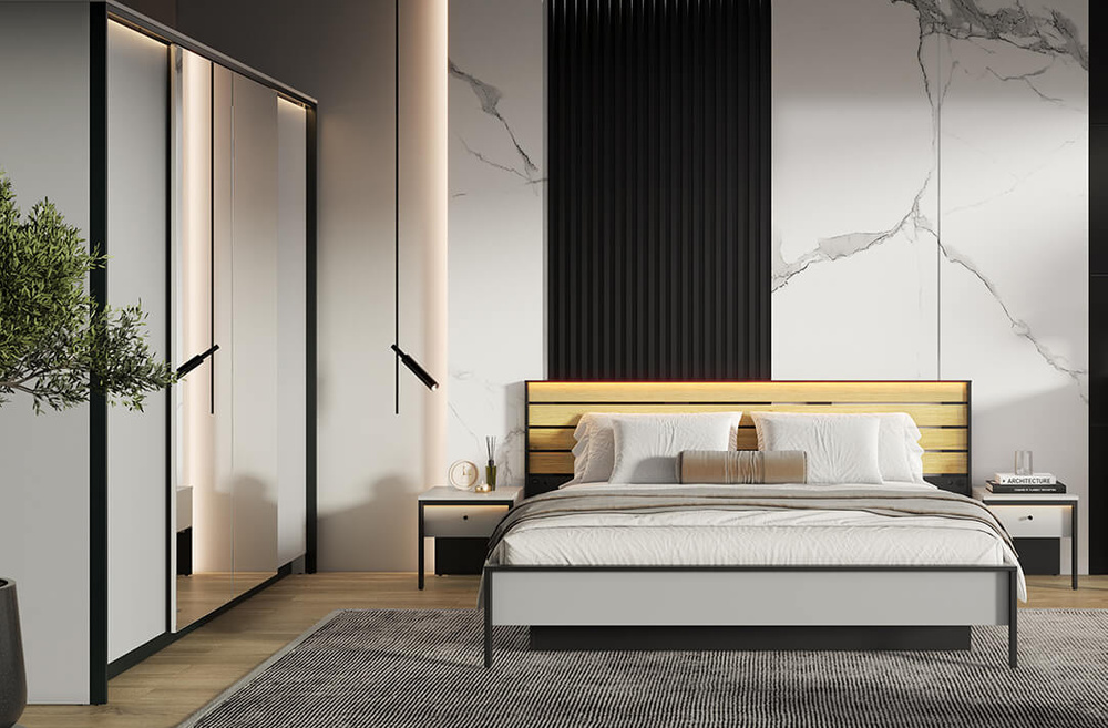 Fyrdörrsgarderob med spegel är en extremt rymlig och multifunktionell sovrumsgarderob i modern stil, utrustad med fyra öppningsbara fronter. En garderob är möbeln du behöver i ditt sovrum. Den är funktionell och har en tilltalande design. En stor spegel monterad på två fronter förstorar sovrumsutrymmet optiskt. Inuti denna garderob finns två galgar, perfekta för att hänga upp kläder i olika längder, och rymliga hyllor. Dessutom är garderoben utrustad med LED-belysning, vilket gör interiören väl upplyst och iögonfallande. Möbeln är gjord av 22 mm laminerad spånskiva och 3 mm HDF-skiva. Den främre spegeln är 3 mm tjock. Tillåten belastning på hyllan är 5 kg.