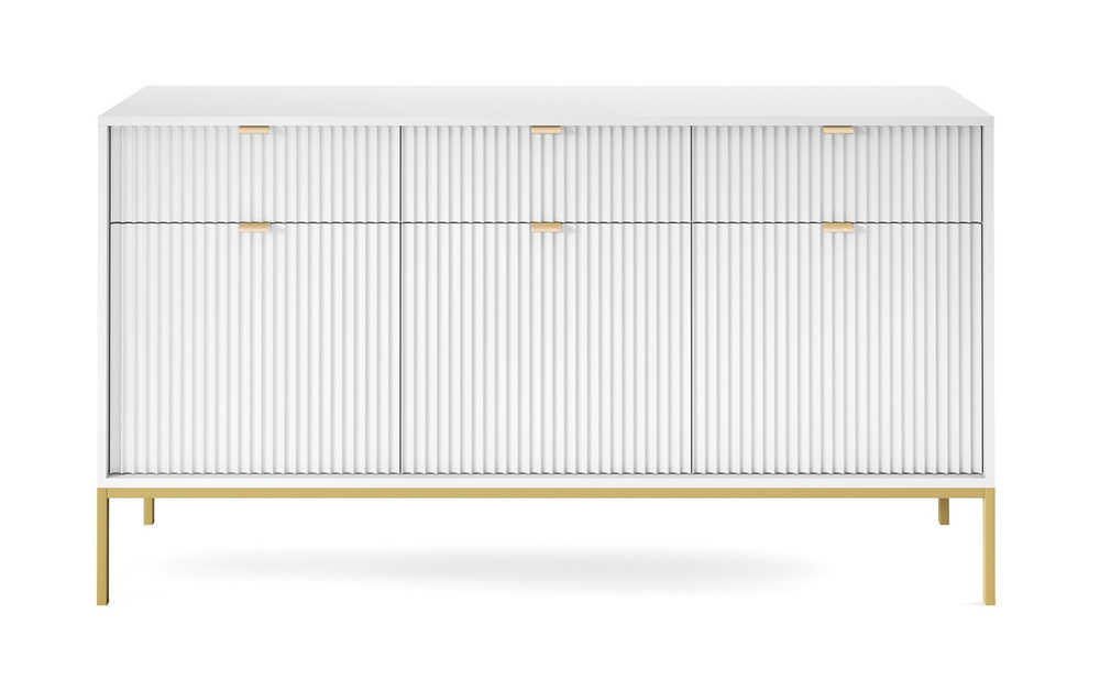 Den stora tredörrars Volare-byrån är ett förslag för människor som vill ta itu med röran för gott och samtidigt ha en vacker och intressant inredning. Bakom ett par eleganta luckor döljer möblerna en extremt rymlig interiör, som består av totalt sex rymliga hyllor och tre bekväma lådor. Denna lösning gör att du hittar tillräckligt med plats för dina tillhörigheter här, tack vare ordningen i rummet. Volare-kollektionen sticker ut från liknande förslag med en moderiktig design, där huvuddekorationen är en räfflad front och en geometrisk bas. Detta gör att möblerna ser extremt attraktiva ut och de kan placeras inte bara i vardagsrummet, utan även i sovrummet, hallen eller gästrummet. Byrån imponerar med en vacker, elegant nyans av svart. Den neutrala nyansen gör det mycket lättare att matcha den till inredningen, så att du enkelt kan skapa ett intressant arrangemang.