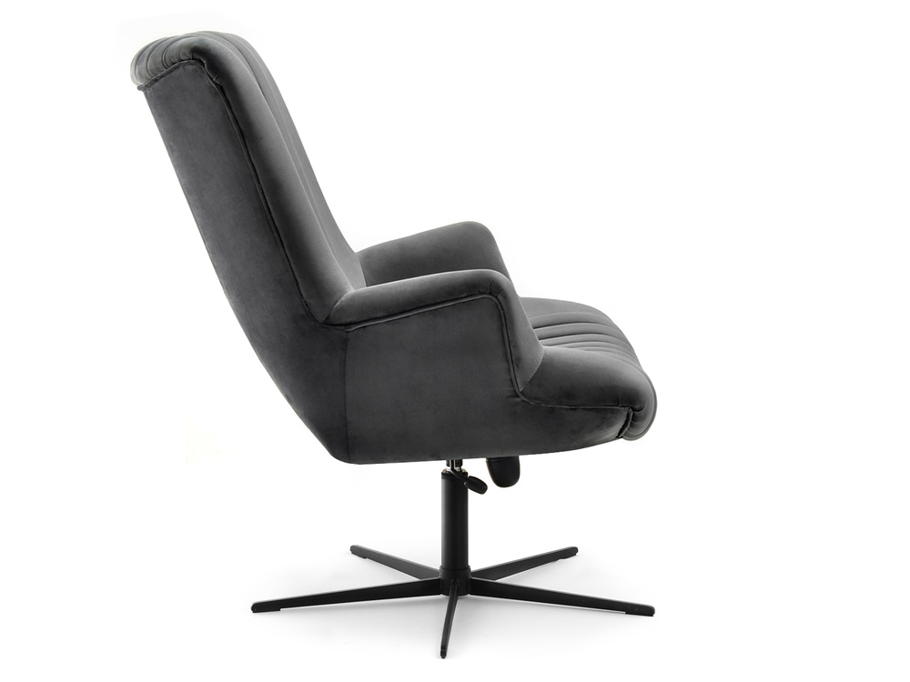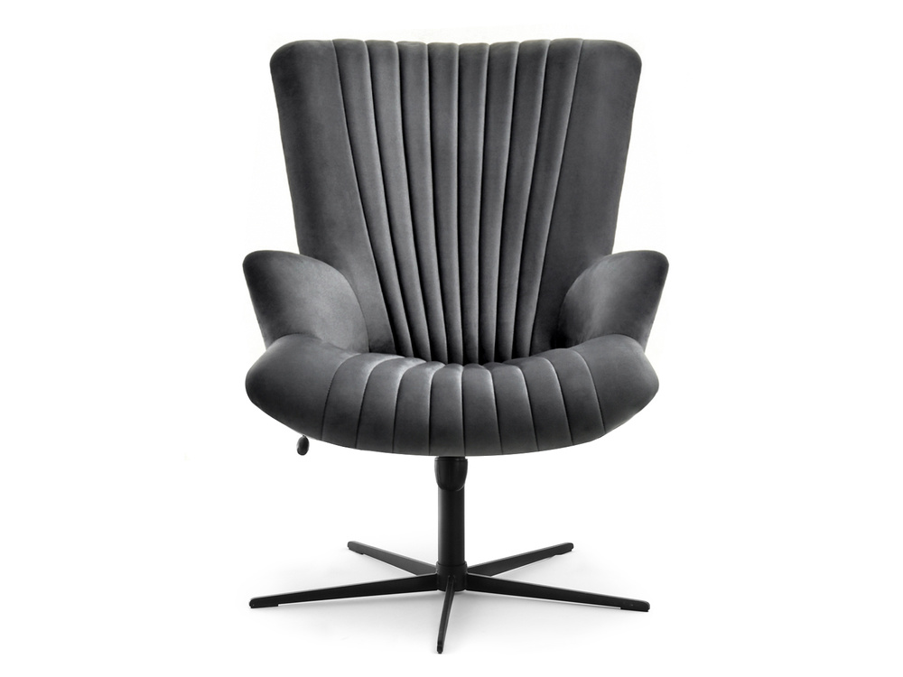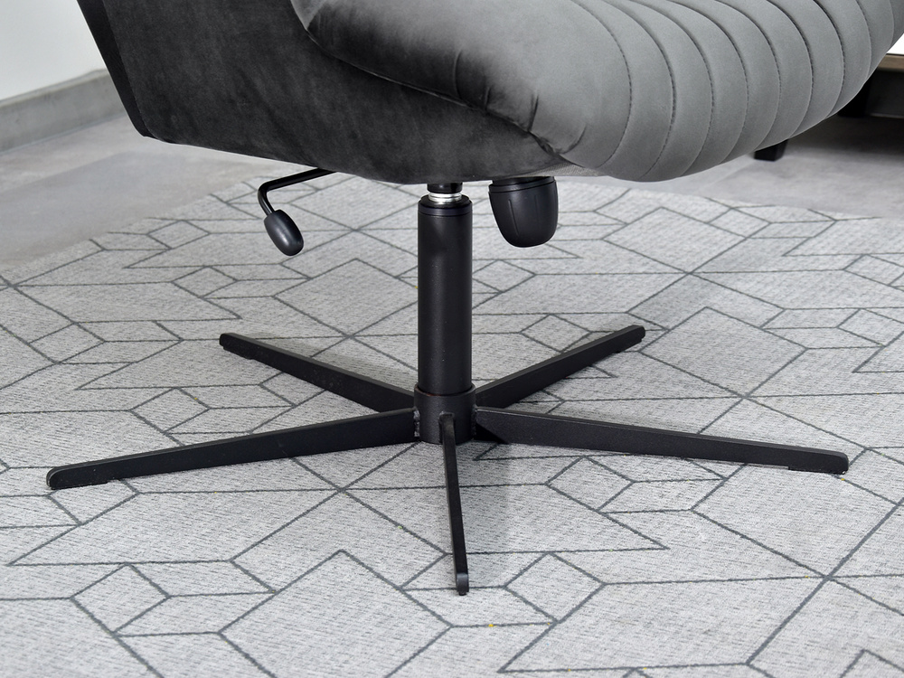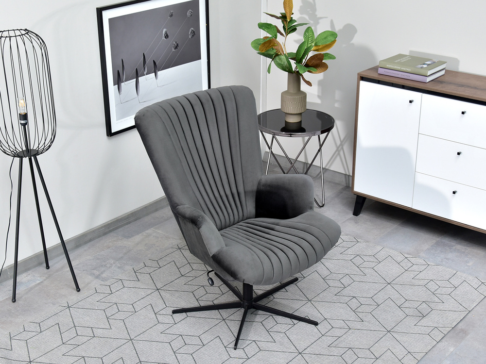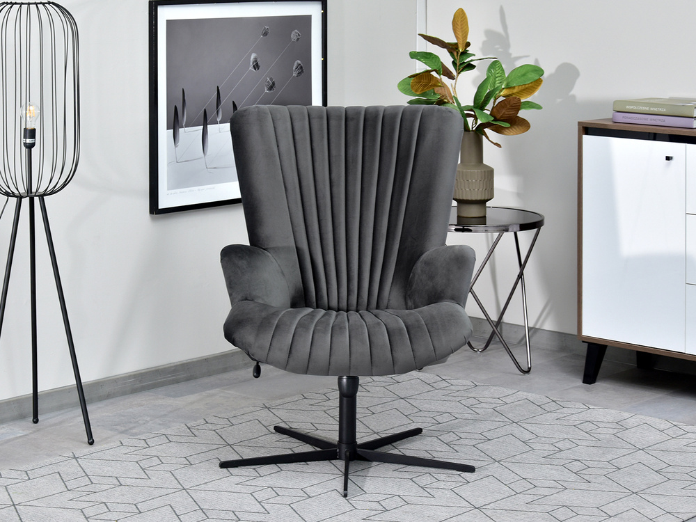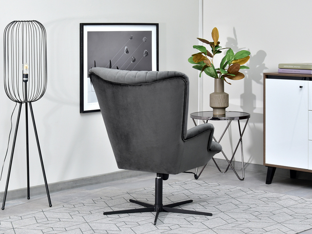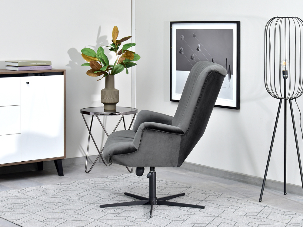 Fåtölj i grafitvelour med svarta ben ESLA är den perfekta kombinationen av elegans och funktionalitet, som passar perfekt in i alla inredningar. Tack till svängbar sits i gungande funktion, fåtöljen ger enastående komfort, oavsett om du arbetar eller kopplar av.