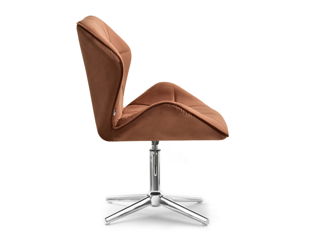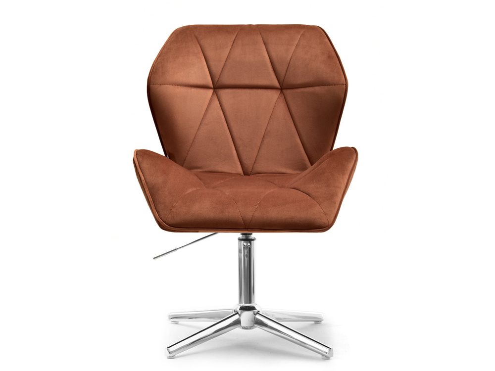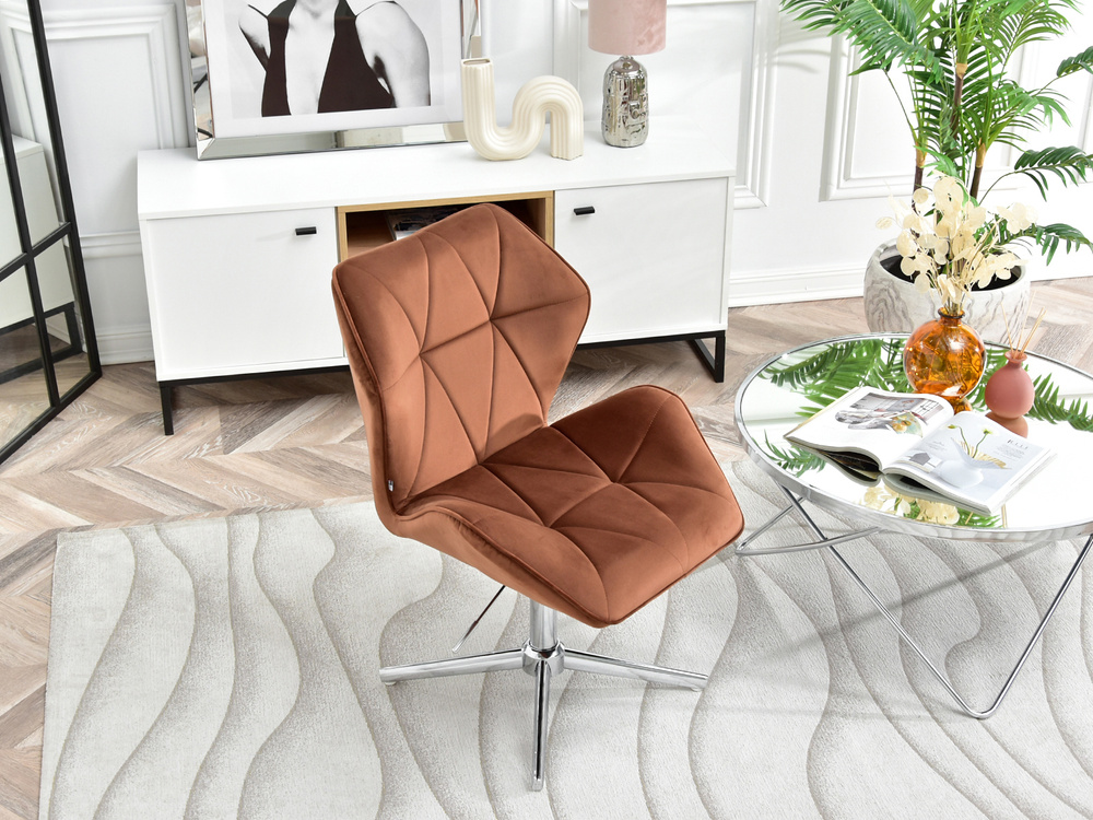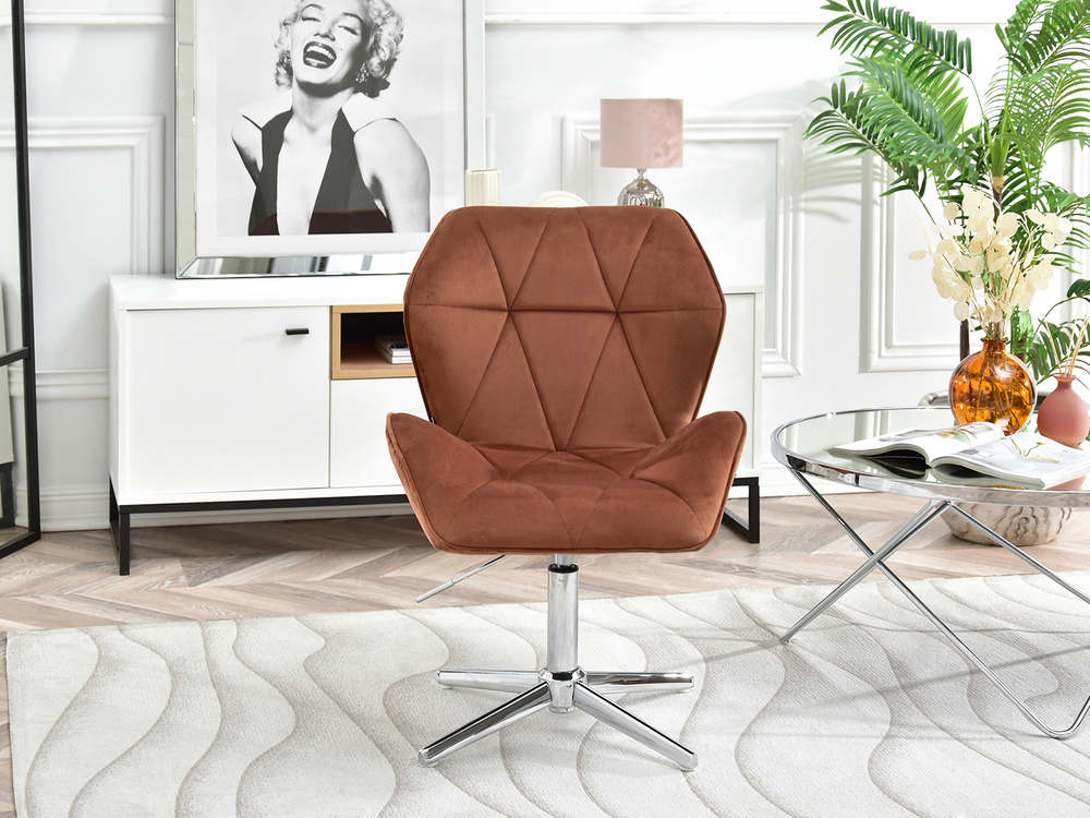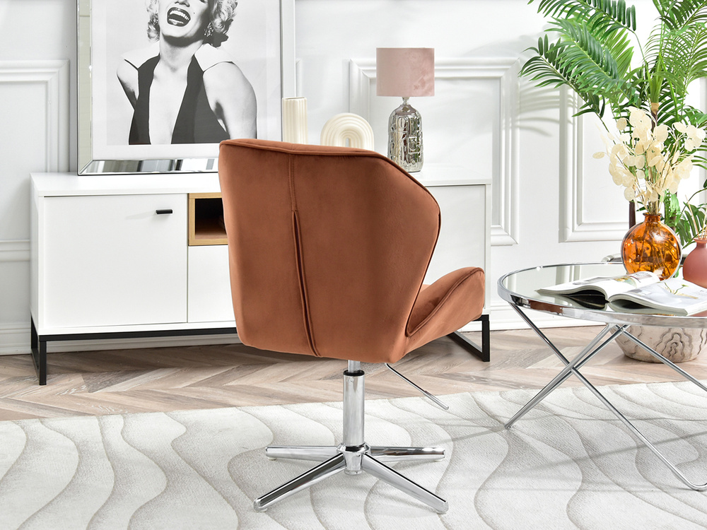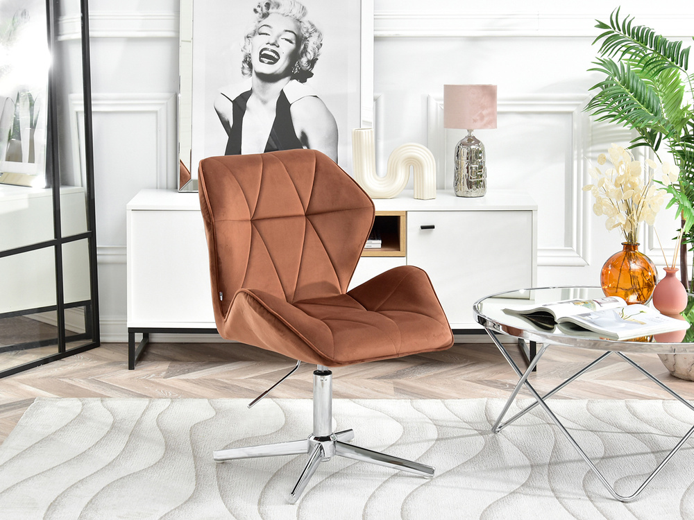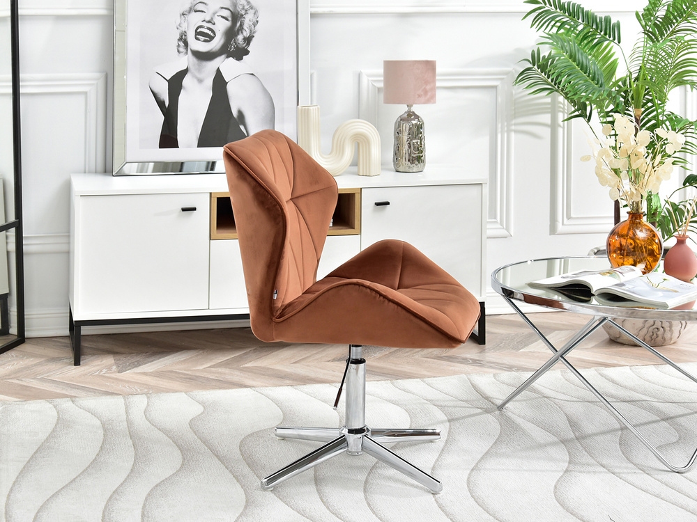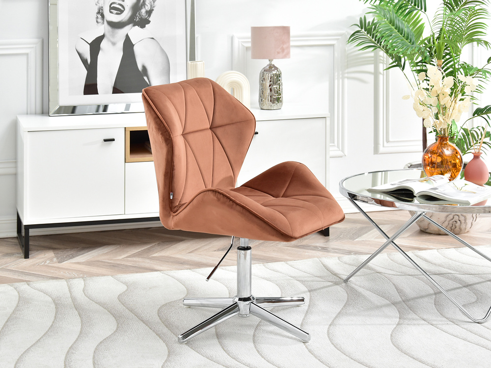 Fåtöljen VELO-STATIC i kopparvelour är den perfekta kombinationen av elegans och funktionalitet, som passar perfekt in i moderna och glamorösa interiörer. Dess vridbara sits garanterar rörelsefrihet och justerbar i höjdled gör att du kan skräddarsy sätet efter dina individuella behov. Tack vare förkromad bas, fåtöljen blir mer stabil och hållbar, vilket gör den till ett utmärkt val för kontoret, affärslokalen, barnrummet eller hemmakontoret.