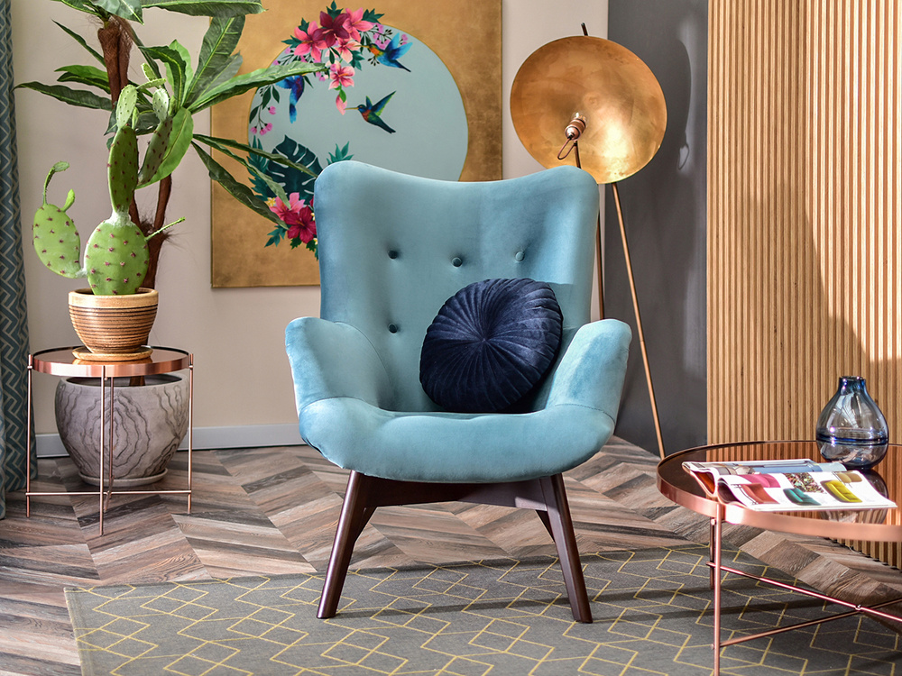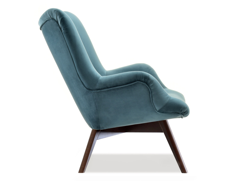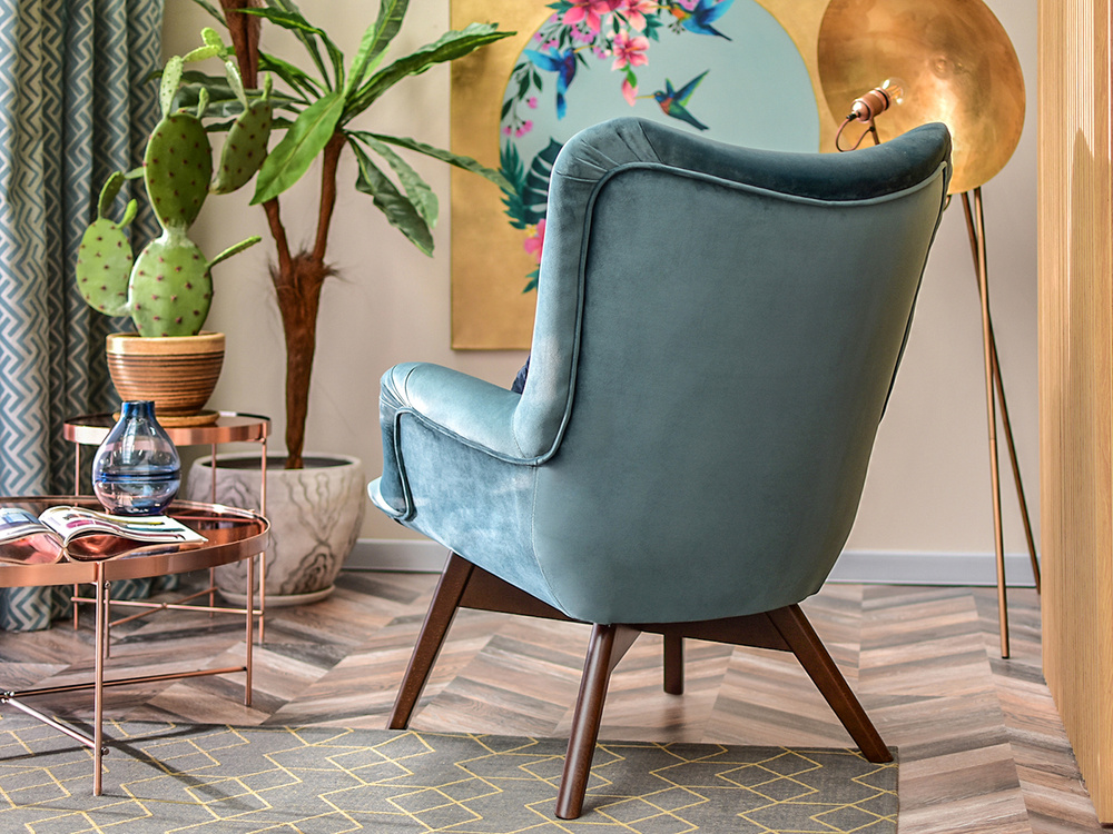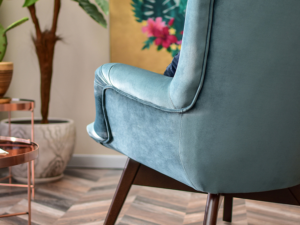 Seafoam velour fåtölj ben valnöt FLORI