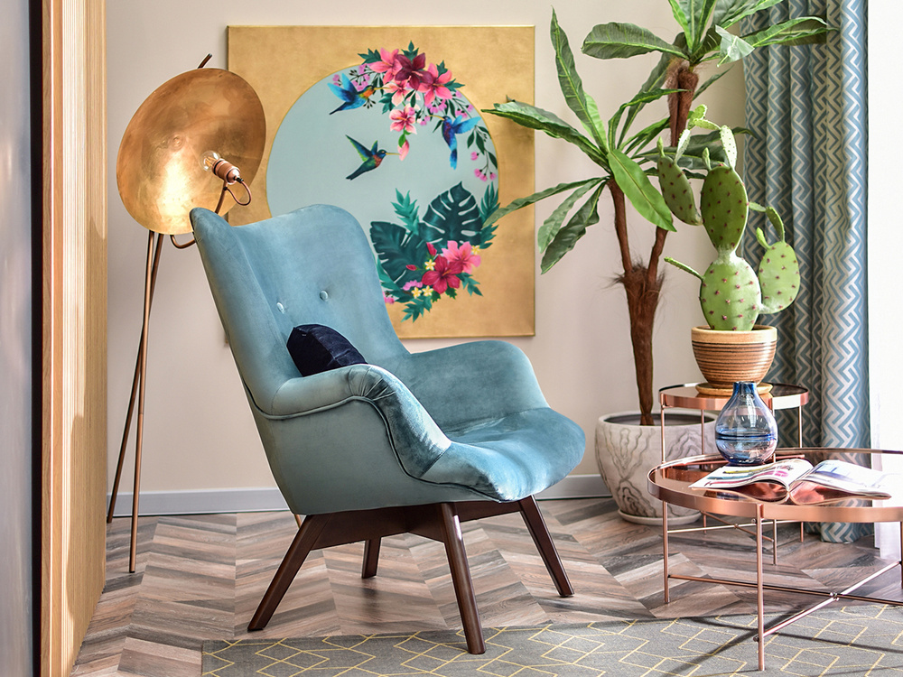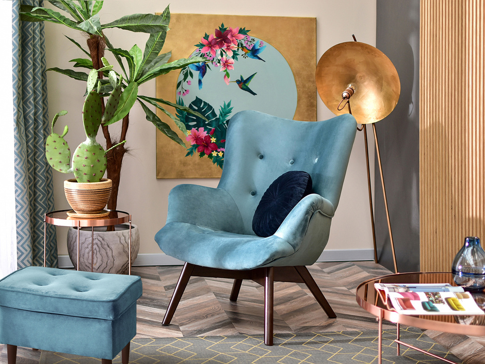 FLORI fåtölj är inte bara en möbel, utan också ett dekorativt element som kommer att betona karaktären i alla rum. Dess marina färg säten i kombination med ben i valnöt skapar en harmonisk helhet som är ett blickfång och ger inredningen en unik charm.