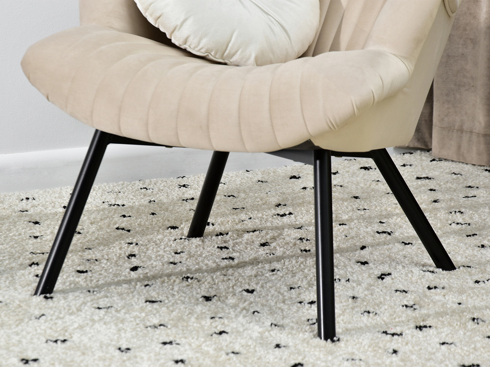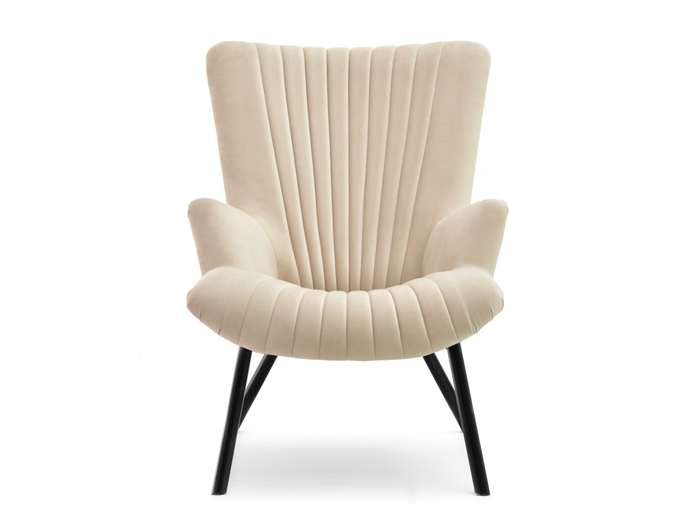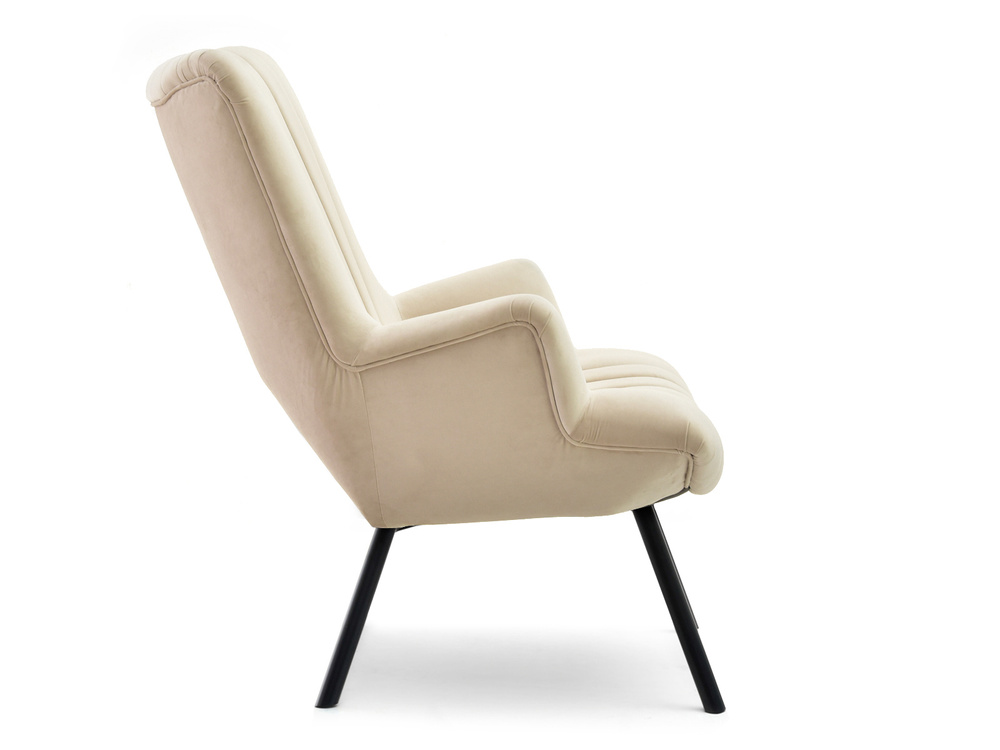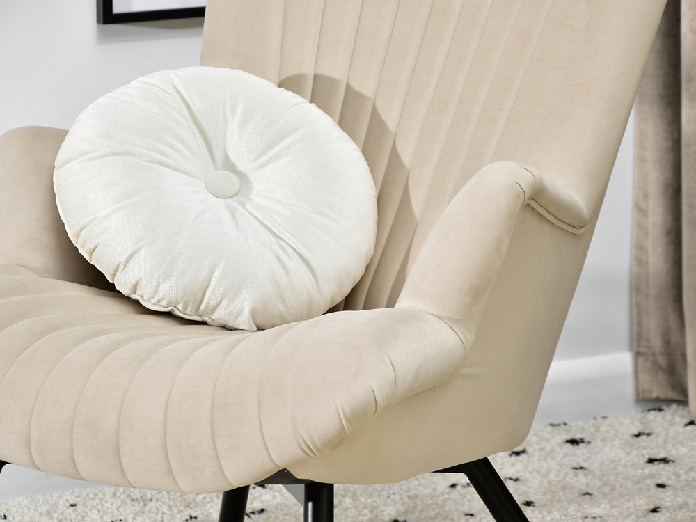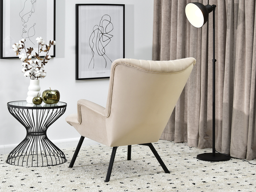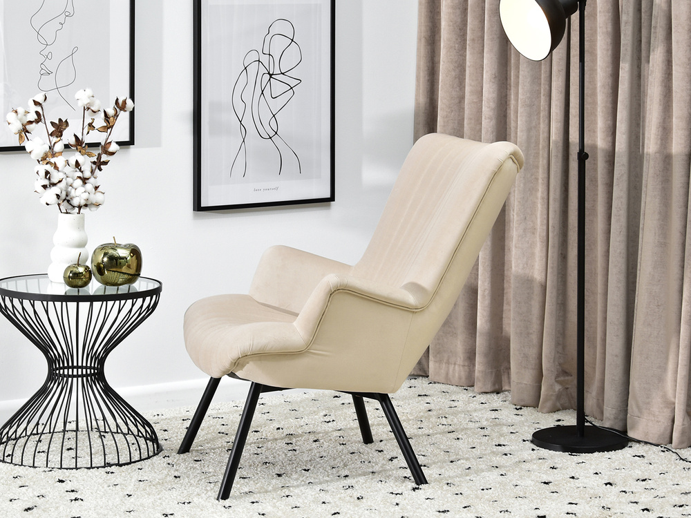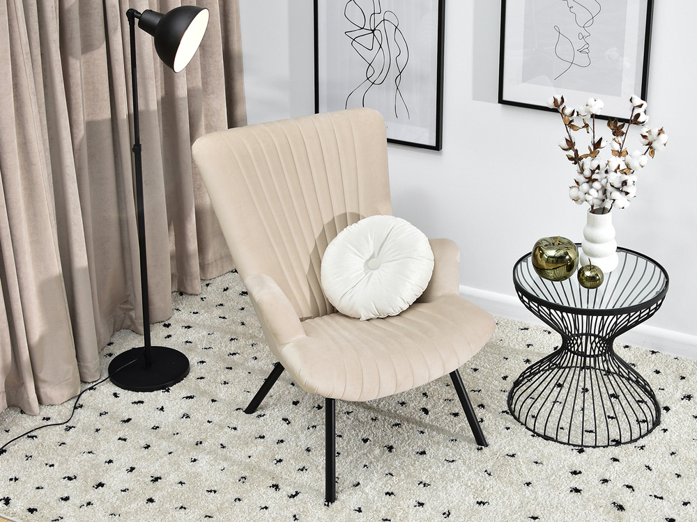 Beige velourfåtölj med svarta ben LANZA är den perfekta kombinationen av elegans och funktionalitet, som passar perfekt in i moderna och industriella interiörer. Tack vare användningen av högkvalitativa material som t.ex stoppningsskum i velour, fåtöljen ger enastående komfort och dess metallbas i svart ger en modern touch.
