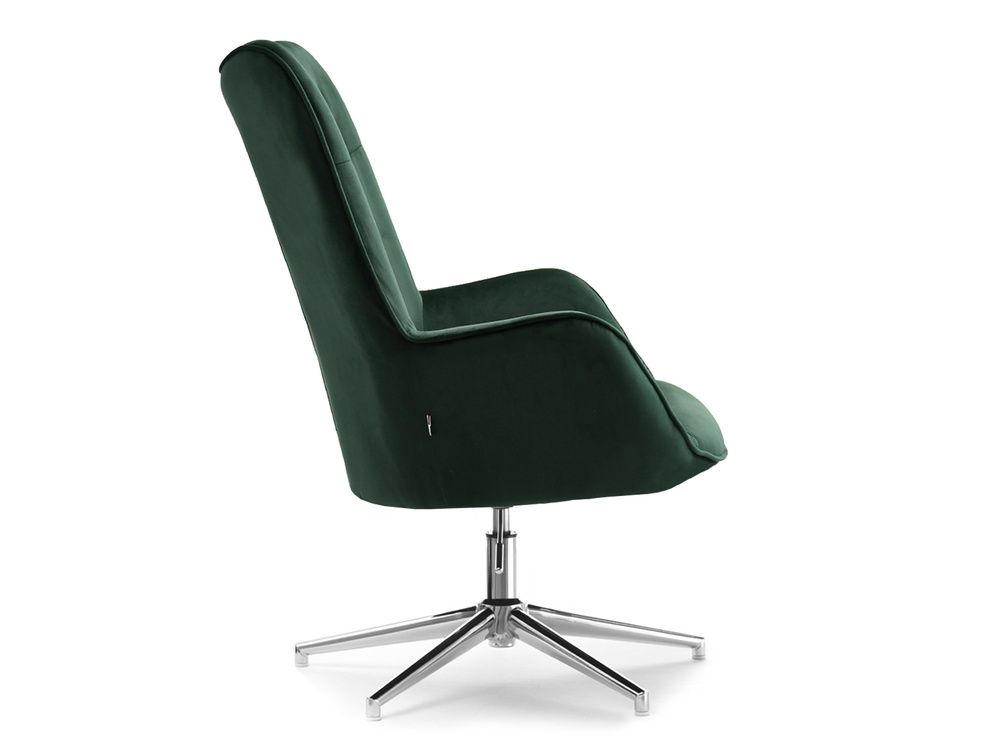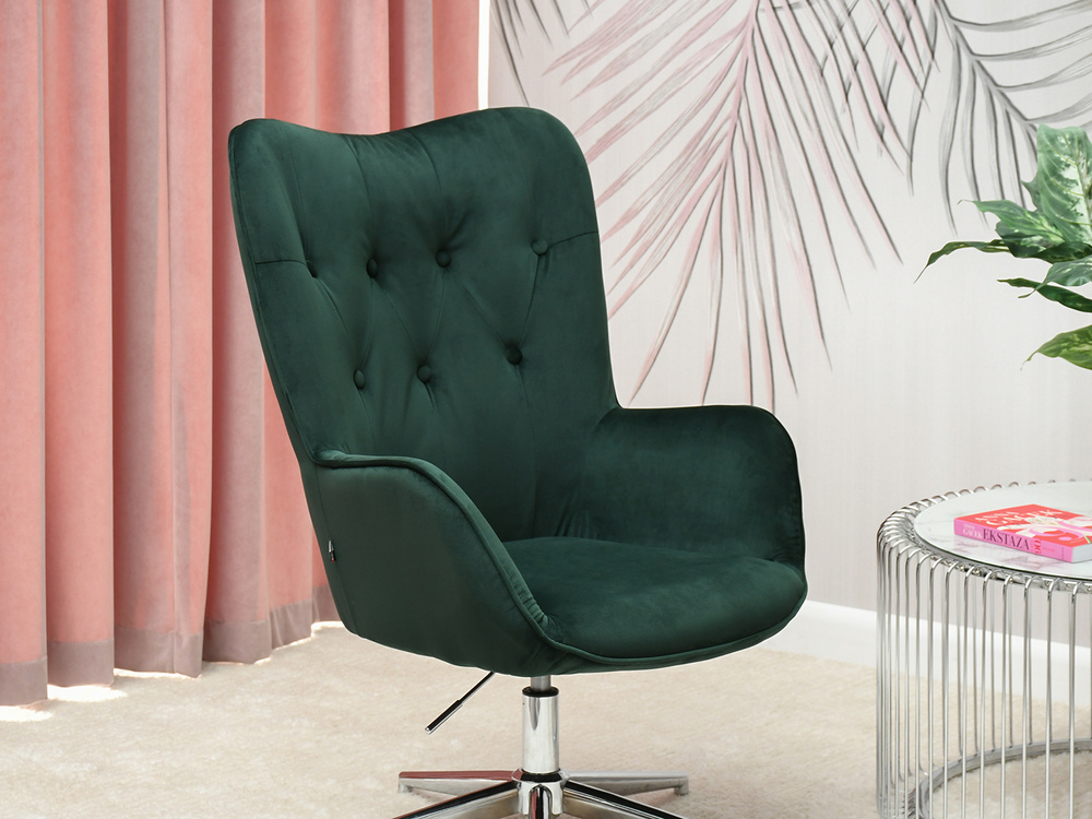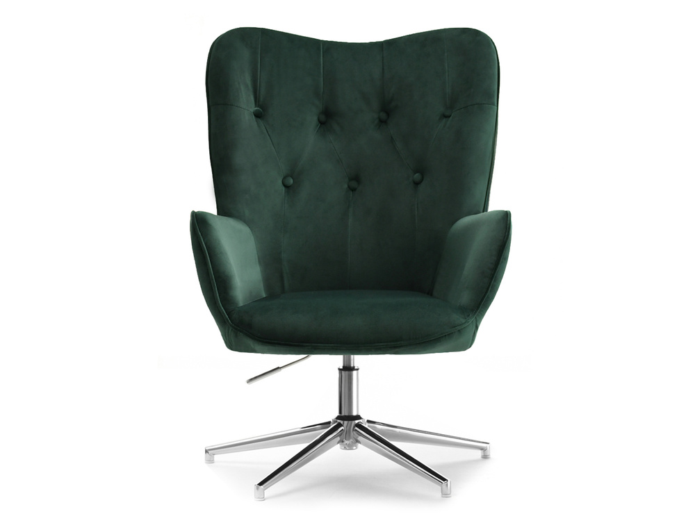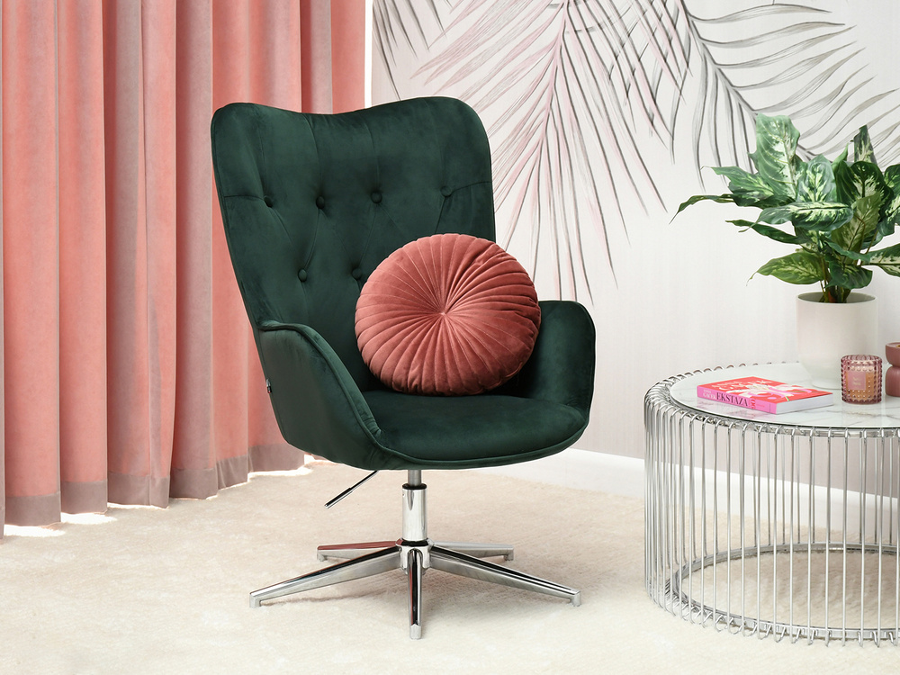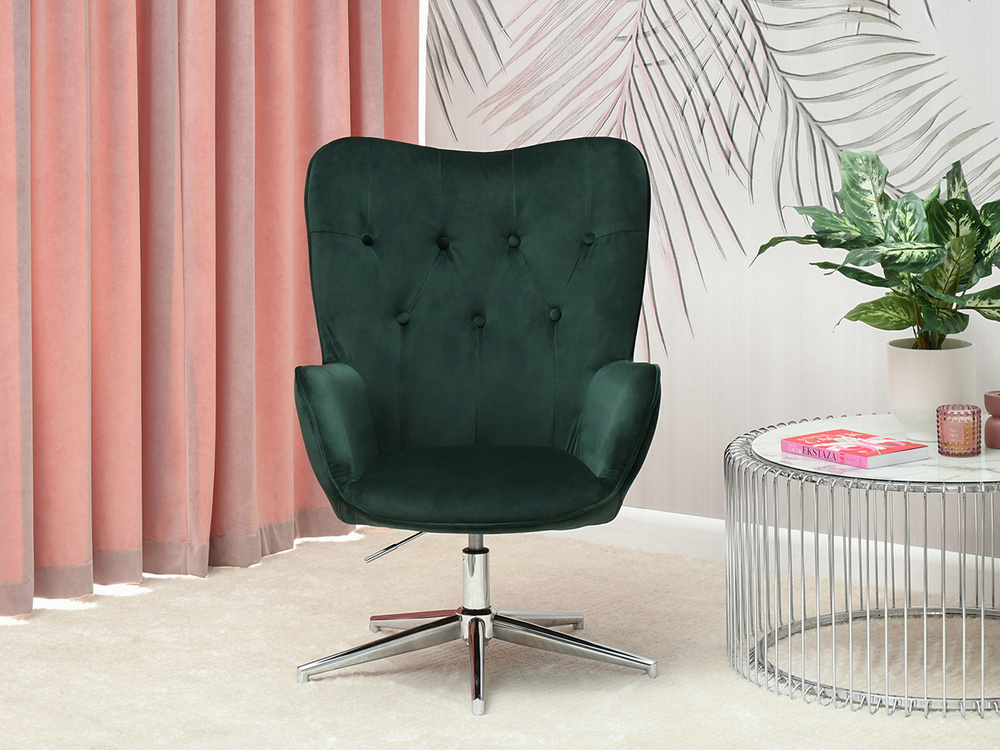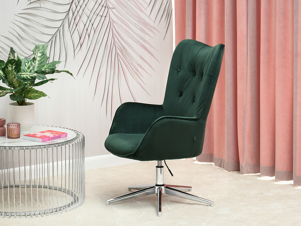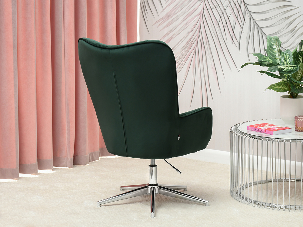 Den gröna velourfåtöljen TRINI är den perfekta kombinationen av elegans och funktionalitet, som passar perfekt med stilen glamourstil och modern. Dess krompläterade ben ger en touch av chic, och den svängbar sits ger fullständig rörelsefrihet, vilket gör den till det perfekta valet för kontoret,servicelokaler,studios hemma,utställningslokal om sovrum.