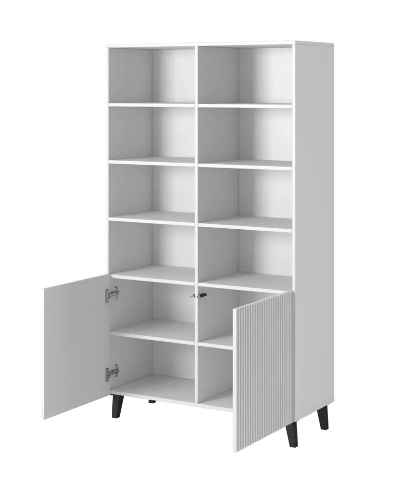 Denna unika modell har hela tolv hyllplan, varav fyra är gömda bakom luckor med intressanta fräsar. Bokhylla vit PAFOS hjälper dig att få plats med många föremål på ett litet utrymme. Tack vare den traditionella, eleganta formen och den extraordinära finishen i vackert vitt kommer denna modell att vara perfekt för smakfulla rum i glamourstil, och kommer att ge god smak till moderna interiörer.