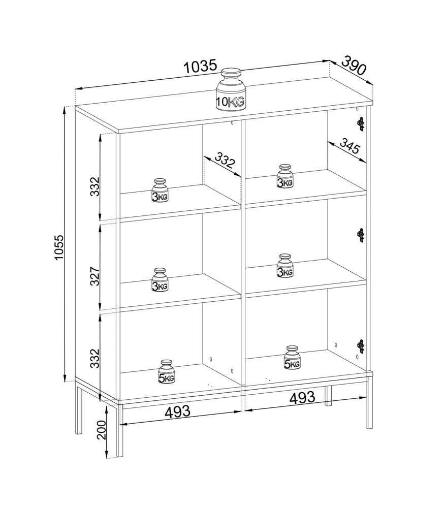 Kommoden är 104 cm bred och 126 cm hög och är tillverkad av 16 mm laminerad skiva och MDF-skiva.