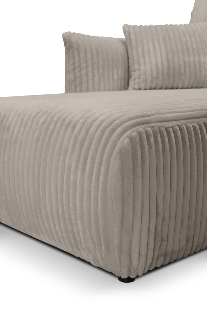 Allora är en beige hörnsoffa med sovfunktion, så att du alltid har plats att övernatta dina gäster. Hela soffan är mjuk och behaglig att ta på tack vare den randiga tyget av typen corduroy. Det är ett mycket modernt material som är mycket populärt bland kunderna. Tyget ger interiören värme och mysighet. Även baksidan av hörnsoffan är klädd med tyg, vilket gör att den kan placeras var som helst i vardagsrummet. En ytterligare fördel med hörnsoffan ALLORA är den stora sovfunktionen för två personer, med en sovyta på hela 145x212 cm, precis som i en traditionell säng. Detta garanterar komfort och bekvämlighet. Hörnsoffan fälls ut enkelt och snabbt. Tack vare DL-mekanismen är det extremt enkelt – du behöver bara dra ut en del av sitsen och fälla ner ryggstödet. Och vad som är mycket viktigt är att hörnsoffan också har ett stort förvaringsutrymme för sängkläder, kuddar och extra filtar.