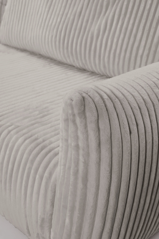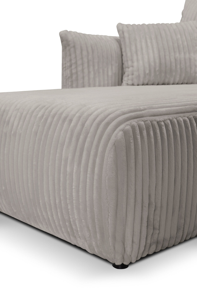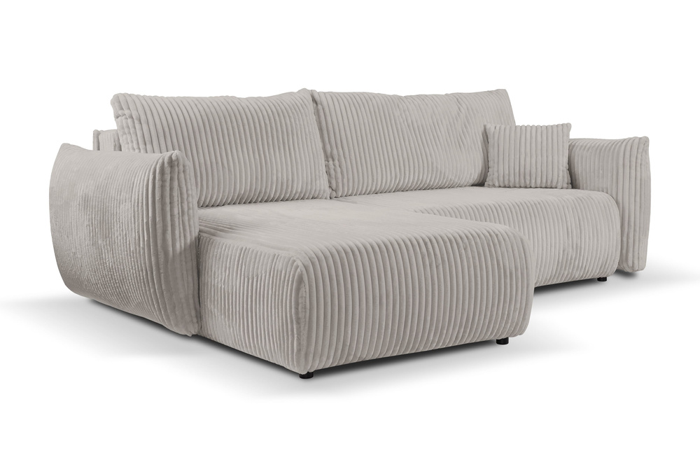Allora är en grå hörnsoffa med sovfunktion, så att du alltid har plats att övernatta dina gäster. Hela soffan är mjuk och behaglig att ta på tack vare den randiga tyget av typen corduroy. Det är ett mycket modernt material som är mycket populärt bland kunderna. Tyget ger interiören värme och mysighet. Även baksidan av hörnsoffan är klädd med tyg, vilket gör att den kan placeras var som helst i vardagsrummet. En ytterligare fördel med hörnsoffan ALLORA är den stora sovfunktionen för två personer, med en sovyta på hela 145x212 cm, precis som i en traditionell säng. Detta garanterar komfort och bekvämlighet. Hörnsoffan fälls ut enkelt och snabbt. Tack vare DL-mekanismen är det extremt enkelt – du behöver bara dra ut en del av sitsen och fälla ner ryggstödet. Och vad som är mycket viktigt är att hörnsoffan också har ett stort förvaringsutrymme för sängkläder, kuddar och extra filtar.