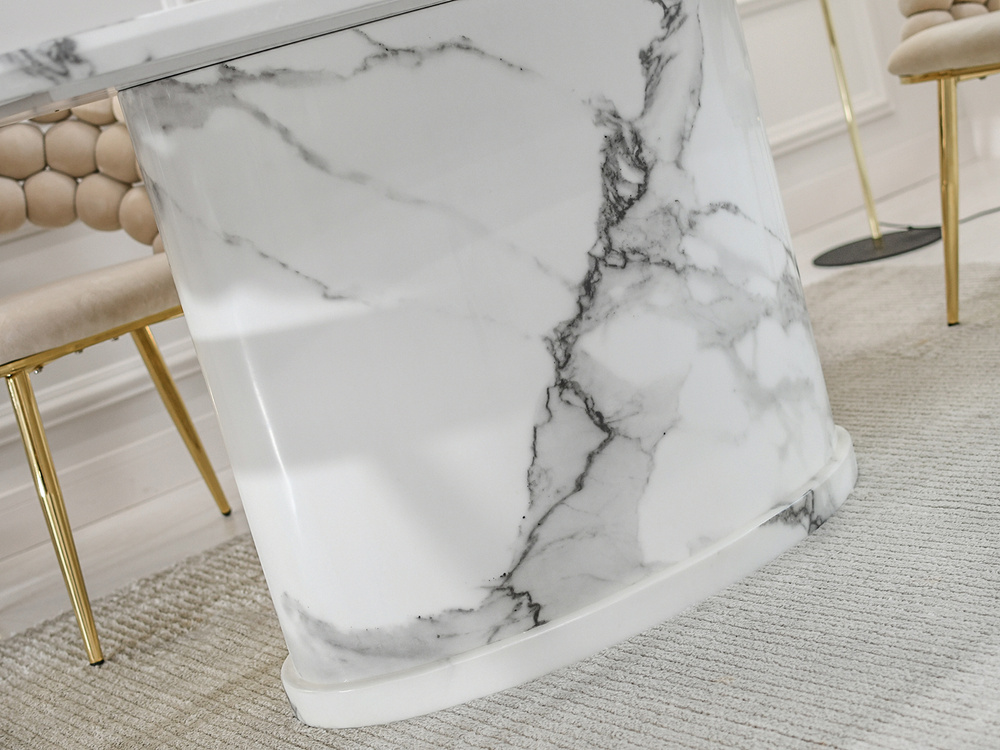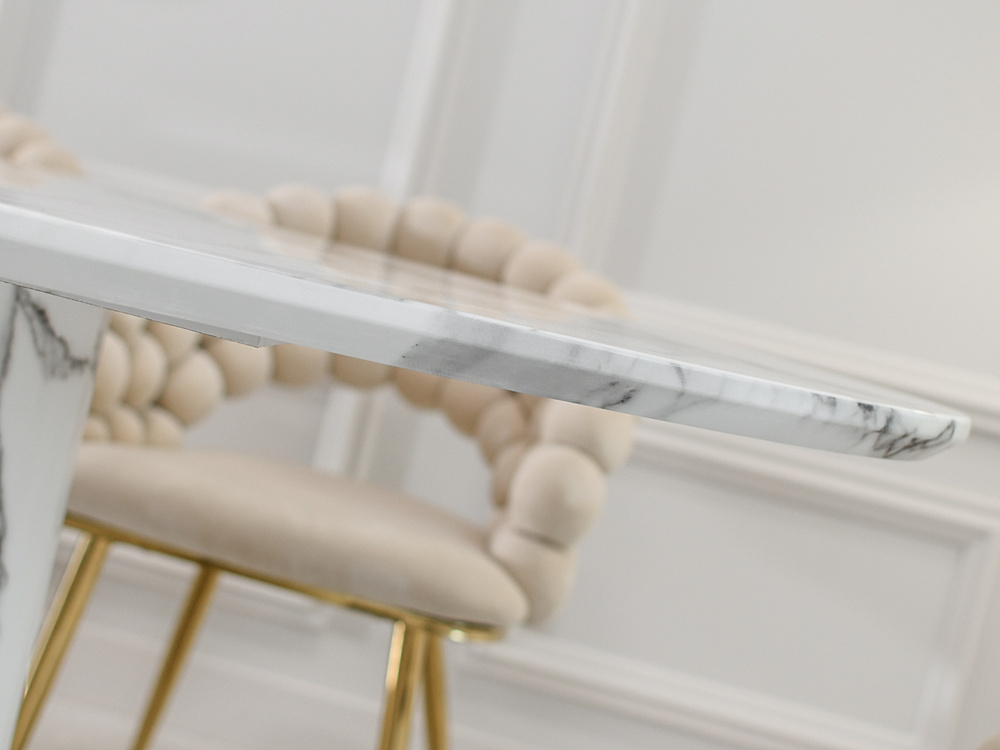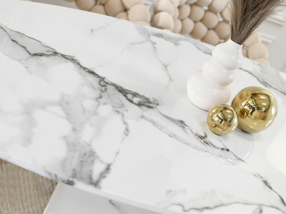 BELONA-konsolen är den perfekta lösningen för dig som letar efter en möbel med elegant design och lyxig finish. Den ovala bordsskivan i vit marmor och det högglansiga mittbenet skapar en unik komposition som är perfekt för moderna och klassiska interiörer.