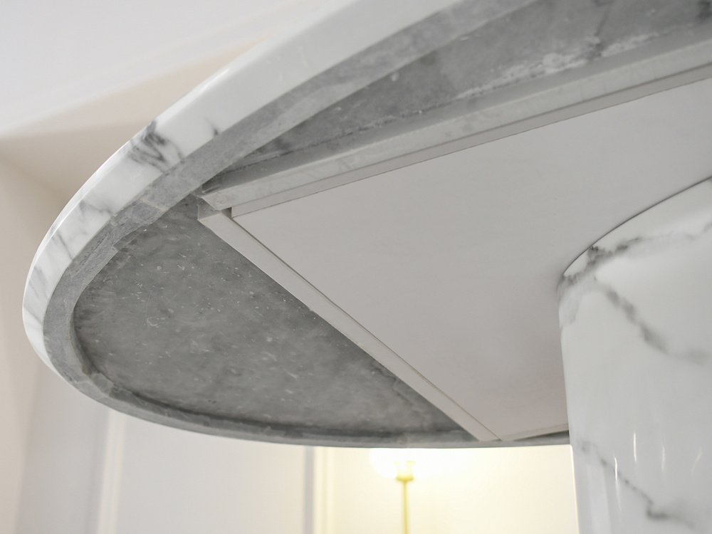- Oval topp, beläggning av vit marmorimitation, lätt att rengöra och slitstark.