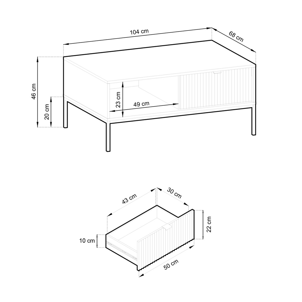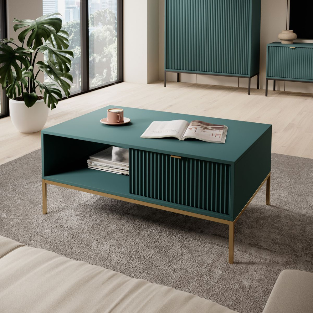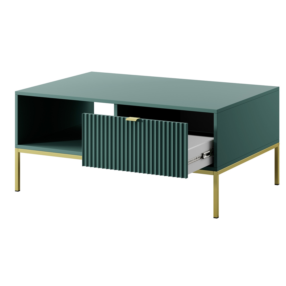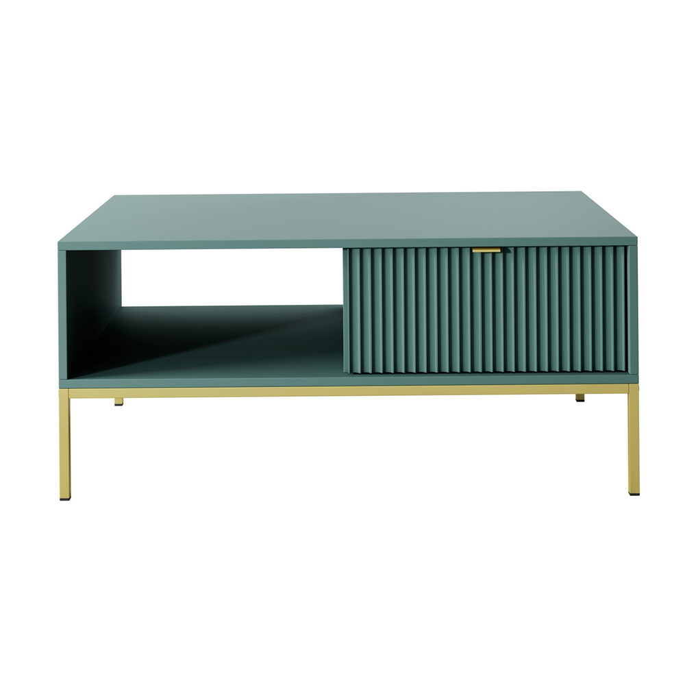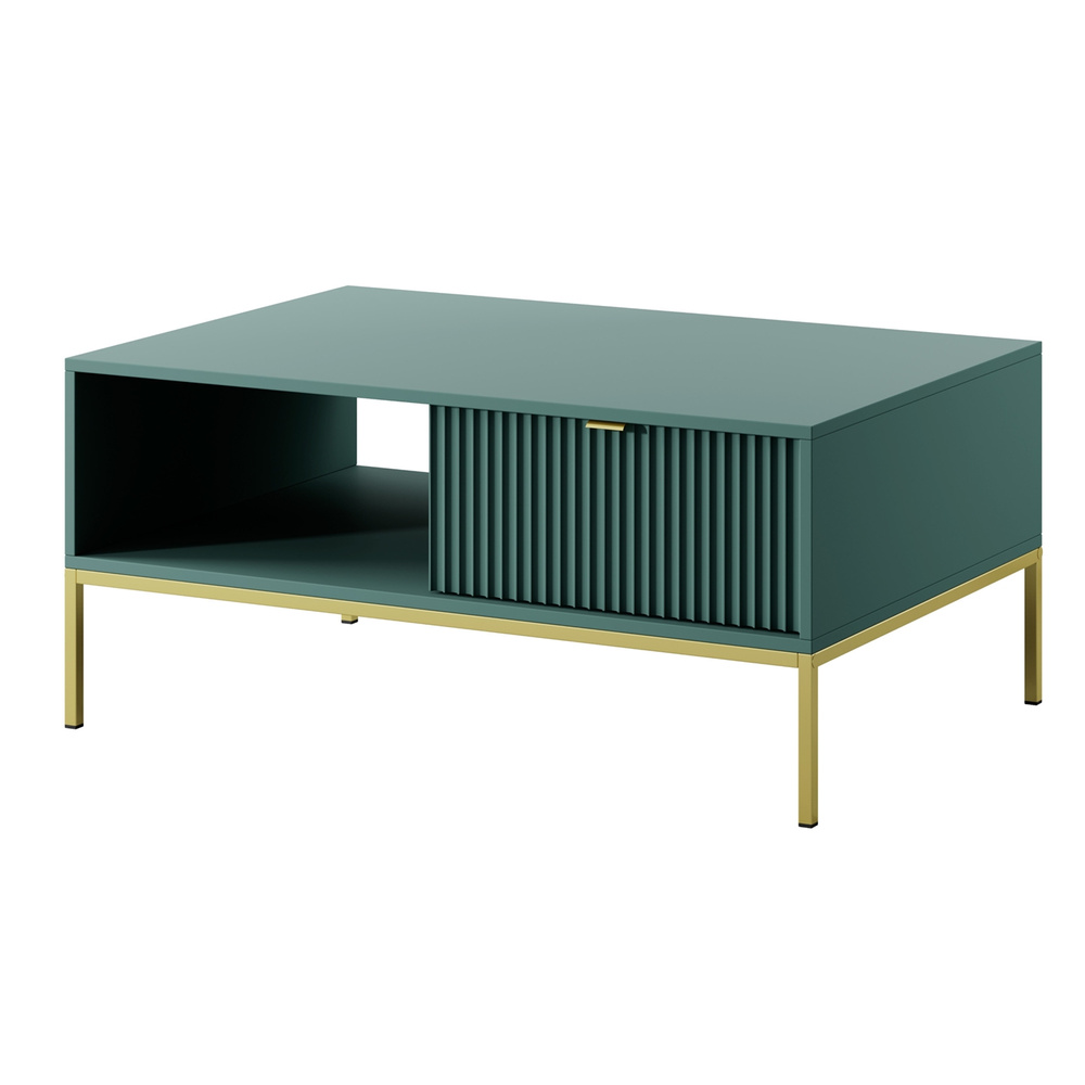 VOLARE soffbord med låda kommer perfekt att komplettera ditt vardagsrum. Det kommer att förändras från ett tråkigt rum till ett funktionellt och vackert presenterat rum för avkoppling. Den här möbeln har en rymlig, slät, rektangulär topp som du enkelt kan ställa på till exempel en vas full med blommor och en kopp kaffe till en kompis när hon kommer på besök. Soffbordet är utrustat med ett praktiskt öppet utrymme och en rymlig låda. Du hittar plats för boken du läser, surfplattan eller fjärrkontrollen till TV:n här. Ditt utrymme kommer att se snyggt ut och allt detta är till hands! Bordet kompletteras av smala, höga ben som matchar kroppens färg fint. Denna lösning gör hela utseendet extremt elegant. VOLARE-kollektionen är helt annorlunda än de tidigare du kanske har sett på vår hemsida. Den designades för att passa dagens trender - höga, gyllene ben, geometrisk form och färg framhäver elegans och modern stil, men refererar också starkt till loftatmosfären. Det minimalistiska gyllene handtaget ger möblerna extra värde och ökar inredningens prestige. Detta är modulära möbler, så de kan kombineras fritt. Det finns inget enkelt mönster för dessa möbler - de passar var du än ser dem.