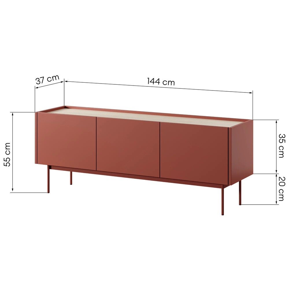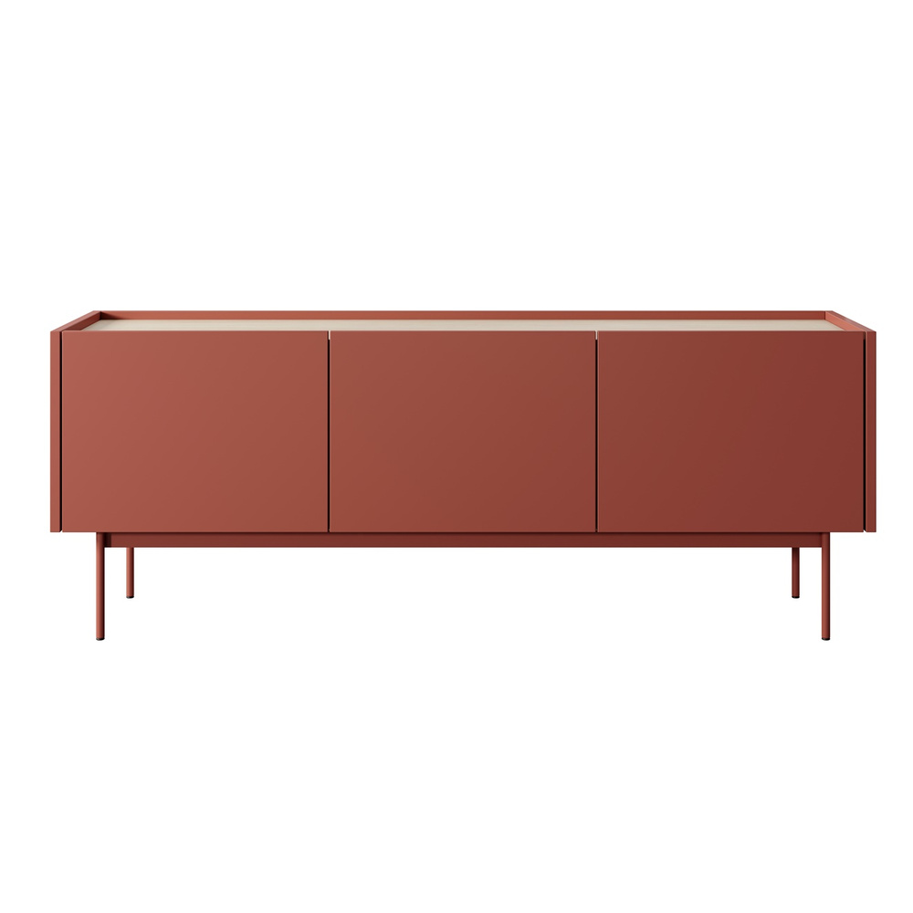 Colorado tredörrars TV-skåp passar perfekt in i din interiör och förvandlar den från en monoton plats till en stilfull och funktionell oas för avkoppling. Denna utrustning erbjuder en rymlig, slät, rektangulär topp på vilken du enkelt kan placera blommor eller små dekorationer som inte kommer att störa dig när du tittar på TV. Den är utrustad med tre rymliga hyllor som är perfekta för att förvara din lilla samling skivor, liten elektronik, brädspel eller dokument som du behöver ha ständig tillgång till. Detta kommer att hålla ditt utrymme snyggt och se till att allt du behöver alltid finns till hands. Tv-bänken har även eleganta, höga ben i samma nyans som skåpet, vilket framhäver dess moderna utseende. Det röde TV-skåpet är tillverkat av slitstark spånskiva, vilket garanterar långvarig användning av möblerna.